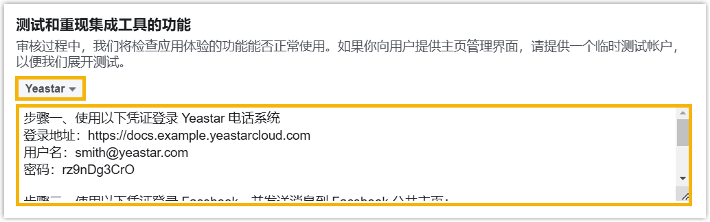 步骤一、使用以下凭证登录 Yeastar 电话系统 登录地址:{pbx_domain_name} 用户名:{email_address} 密码:{password} 步骤二、使用以下凭证登录 Facebook,并发送消息到 Facebook 公共主页:{url_for_facebook_page} 邮箱地址或电话号码:{email_address_or_phone_number} 密码:{password} 步骤三、在 Yeastar 电话系统上查看并回复消息在本例中,我们粘贴的内容如下: