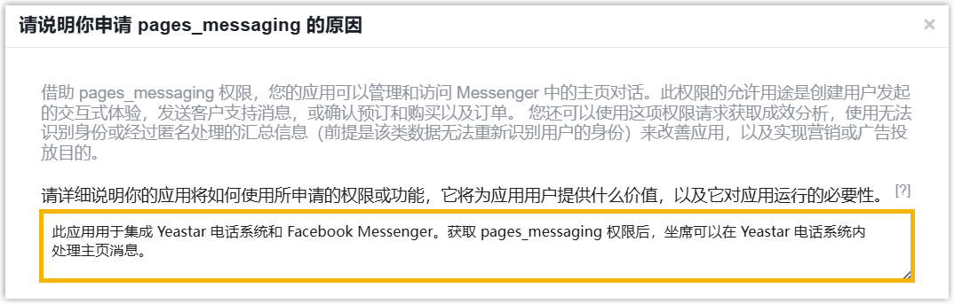 此应用用于集成 Yeastar 电话系统和 Facebook Messenger。获取 pages_messaging 权限后,坐席可以在 Yeastar 电话系统内处理主页消息。