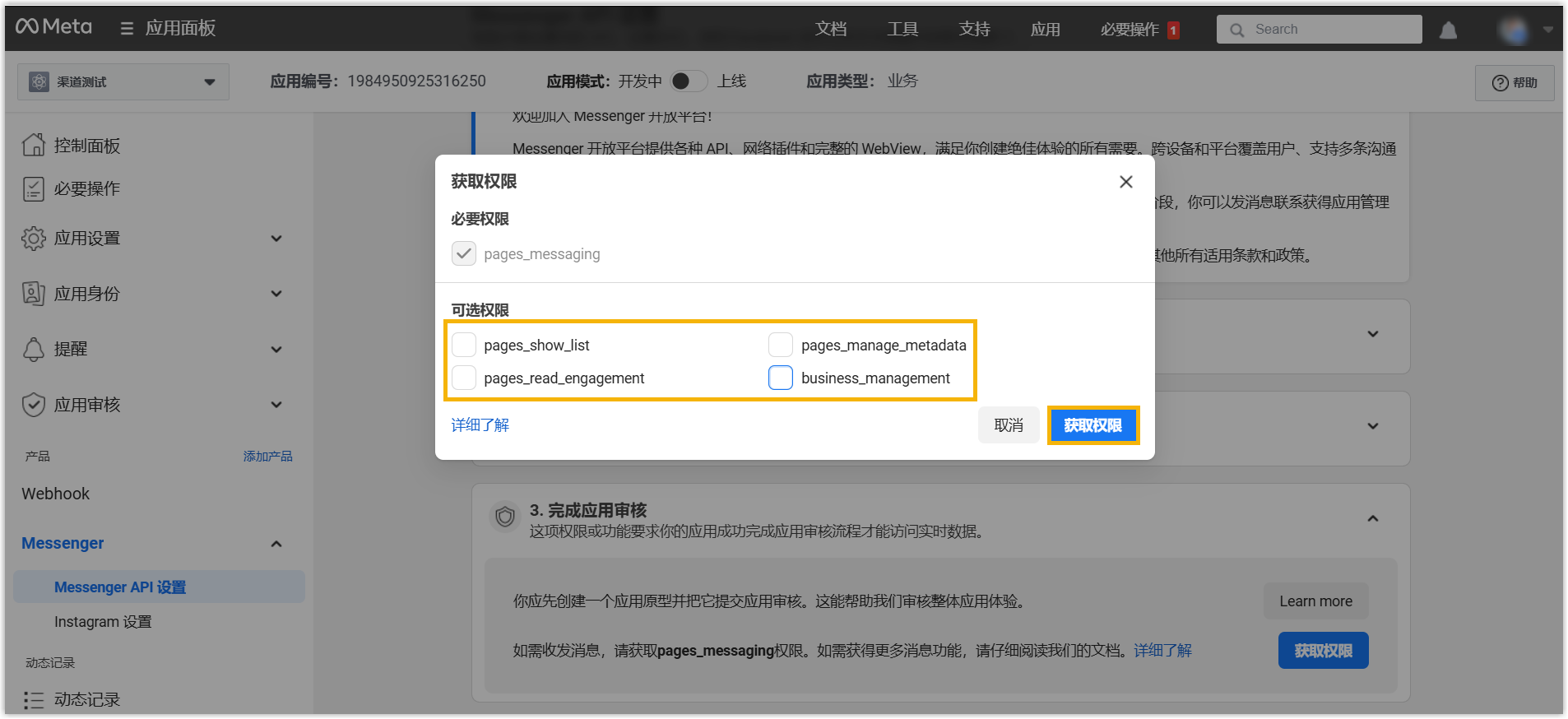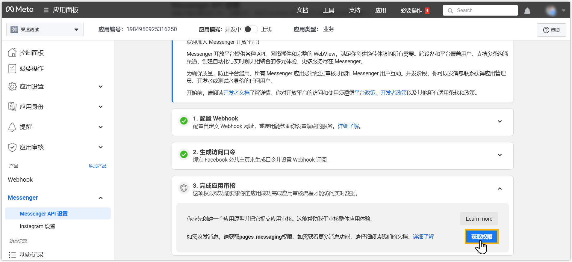 - 完成以下任务以说明为什么需要 pages_messaging 这一高级访问权限以及应用如何使用该权限。