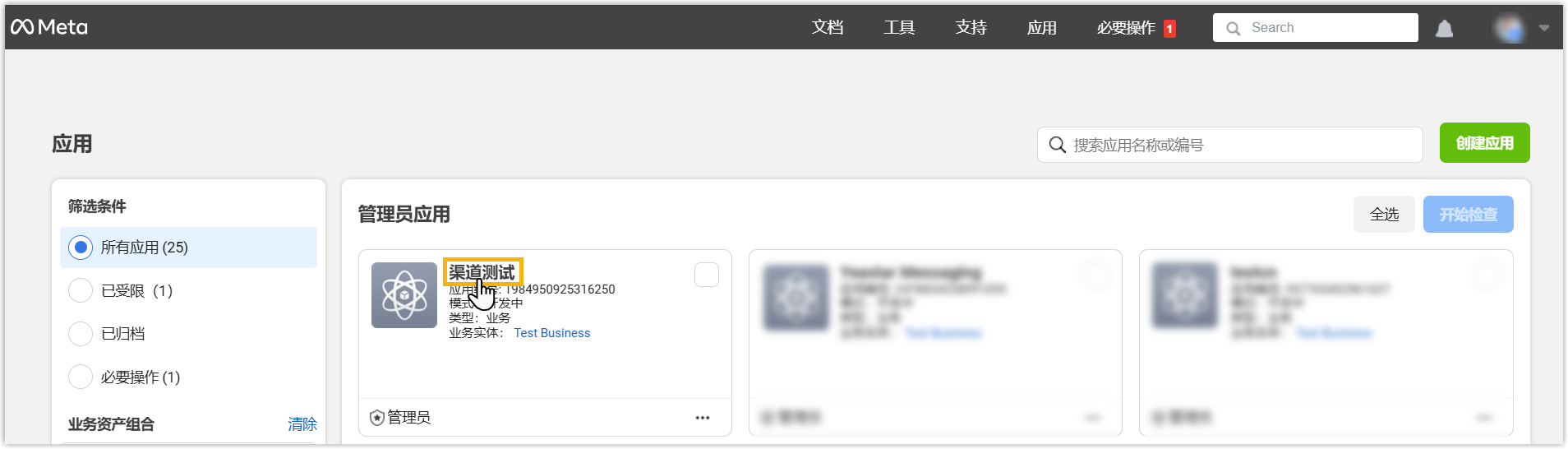 - 登录 Meta 开发者平台,从顶部菜单栏进入