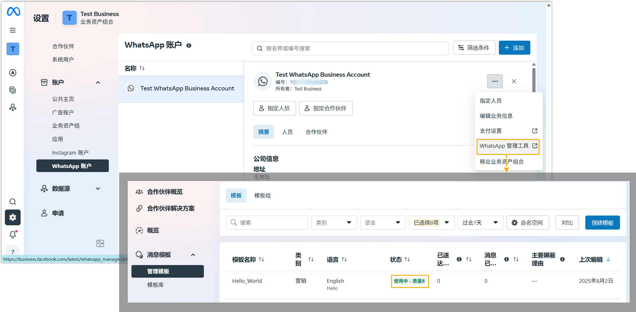 页面会弹出一个窗口,显示与你的 WhatsApp 商业账户关联的所有已同步的消息模板。