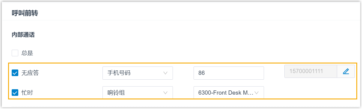 配置 操作说明 来电前转 为确保当分机用户无法接听时,来电可自动转接至备用号码 (如用户的手机号码),完成以下设置: - 在 呼叫前转 栏,针对内部来电,勾选无法接听的场景 (无应答 或 忙时)。