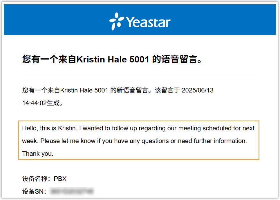 - 用户可在每条收到的语音留言邮件通知的正文中查看转写的文本。注: 此方式仅在分机启用了以下设置时才可用: