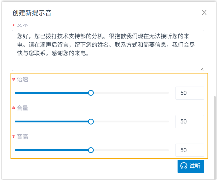 - 添加提示音后,你可以通过修改文本或调整音频设置,方便快捷地更新提示音。注: 从固件版本 84.20.0.128 开始,部分机械感发音的语音选项将不再支持。此前使用这些已停用语音选项生成的提示音仍可继续使用,但无法编辑。