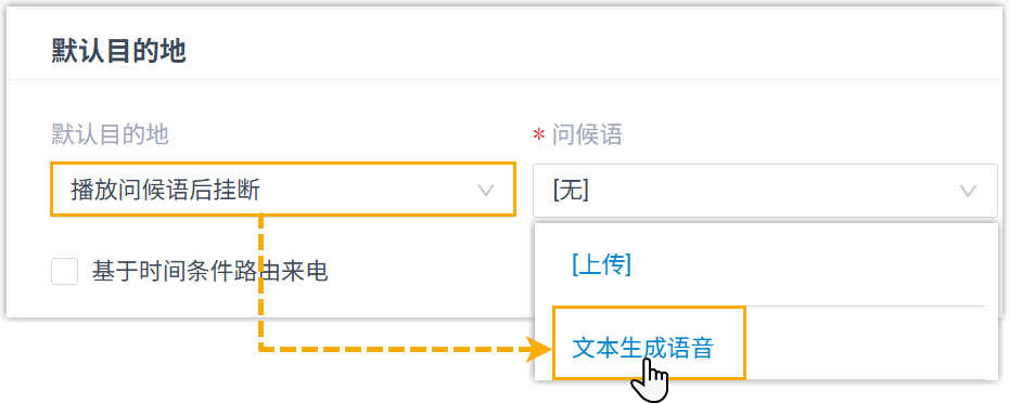 | 呼入路由 | 为呼入路由的默认目的地或基于时间条件的目的地设置问候语 (路径:)。 |