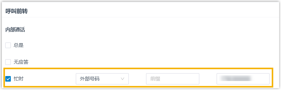 - 在 忙时 旁的下拉列表中,选择 外部号码 作为前转目的地。