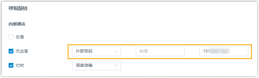 - 在 无应答 旁的下拉列表中,选择 外部号码 作为前转目的地。