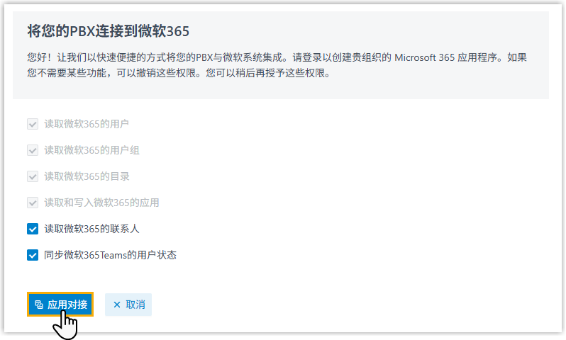 - 查看并配置 Microsoft 365 应用的访问权限,然后点击 应用对接。