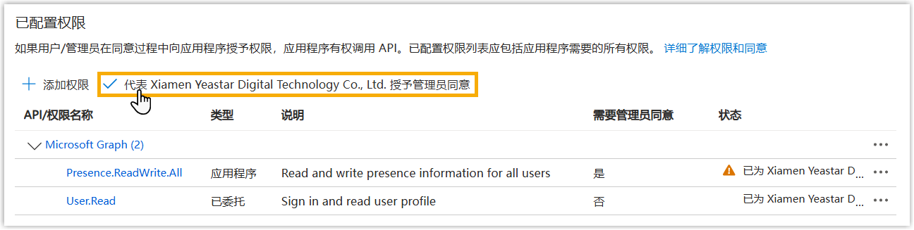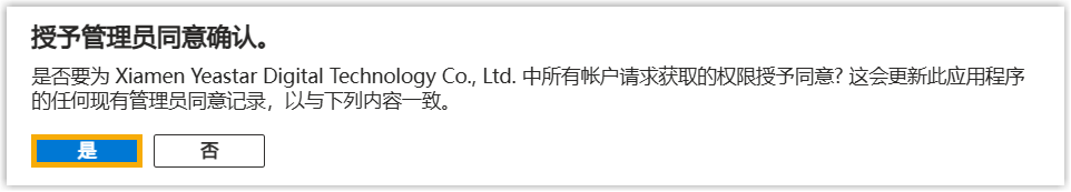 - 点击 授予管理员同意,同意向应用程序授予所需的权限。