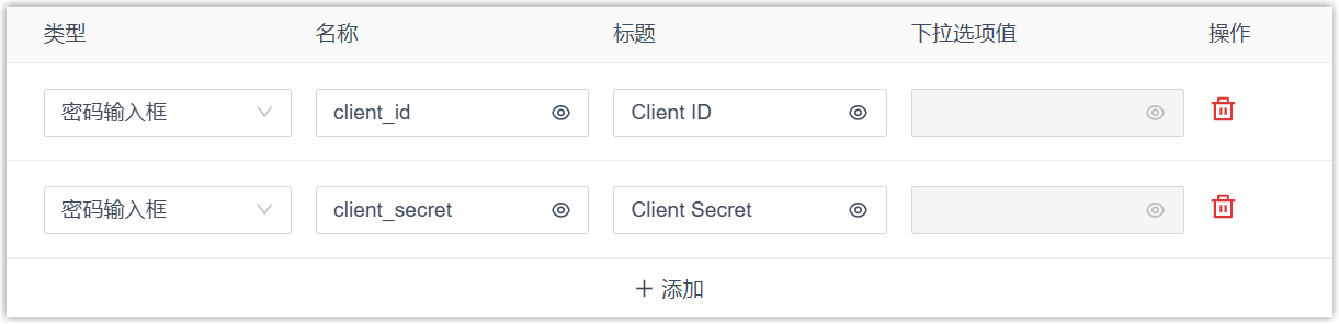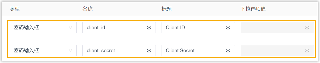 名称 为字段指定变量名称,模板中可根据需要引用此名称。 标题 为字段指定标题,将显示在输入框上方。 下拉选项值 如果 类型 设置为 下拉选项框,在此字段中输入选项。 注: 使用半角逗号,分隔多个选项,例如option1,option2。 - 配置 OAuth2 授权相关设置。