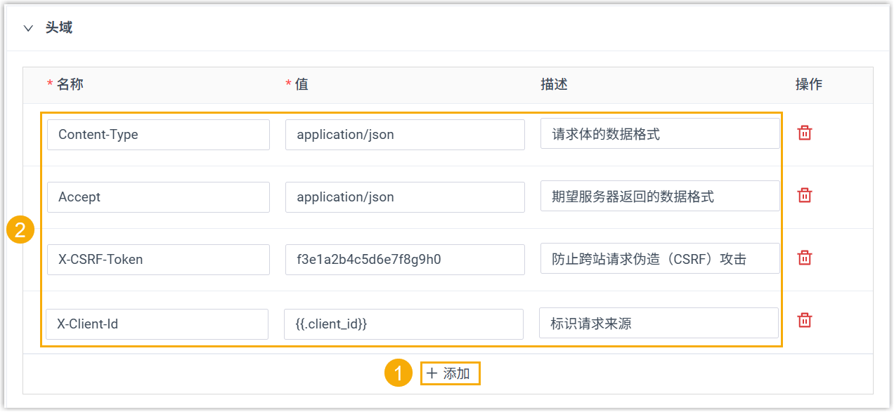 设置 说明 名称 请求头名称,例如 Content-Type(内容类型) 或Accept(期望的数据格式)。值 请求头的值,可以是具体的值,也可以是变量。 注: 认证方式 中定义的变量可用于此处。例如,如果设置了名为client_id的变量,可在此处的值中通过{{.client_id}}引用。描述 简要说明该请求头的作用或用途,便于参考。