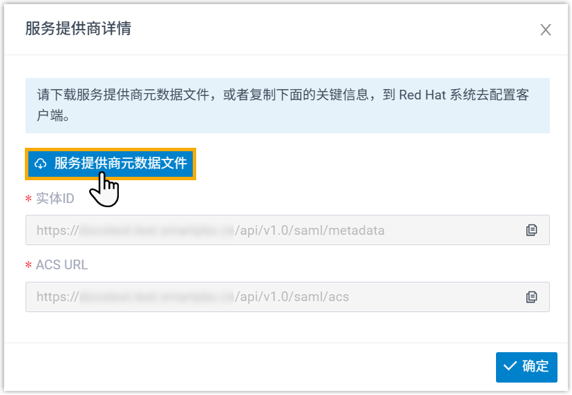 - 在弹出的窗口中,点击 服务提供商元数据文件 下载文件,该文件将在后续配置 Red Hat SAML