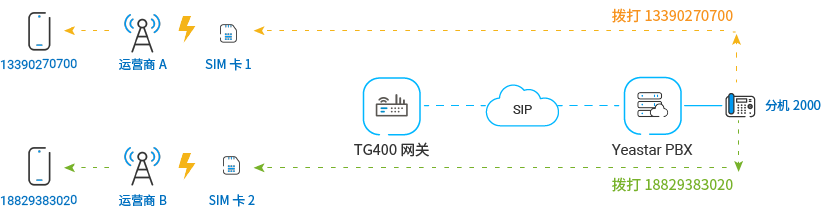 许多运营商都有优惠套餐,可以允许相同运营商的用户之间免费拨打电话或者以更低成本的费用进行通话。本文介绍如何通过指定的 4G 中继呼出外线电话,以达到节约话费的目的。