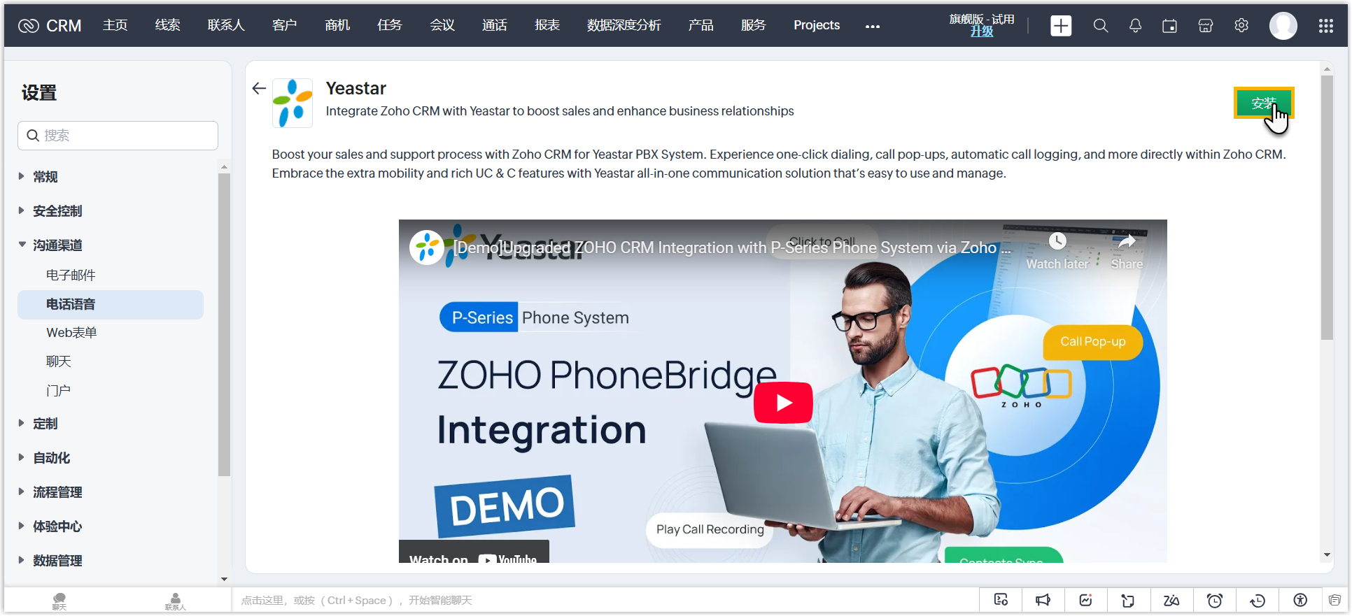 步骤一、从 Zoho Telephony Marketplace 中安装 Yeastar 应用