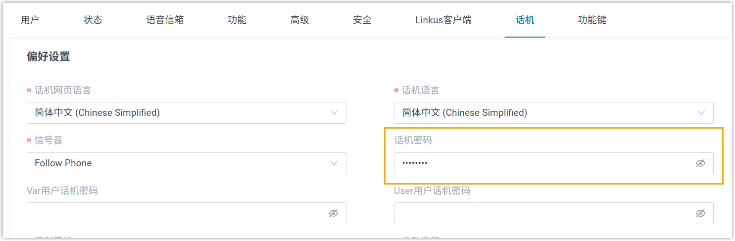 。 - 下拉至 偏好设置 栏,在 话机密码