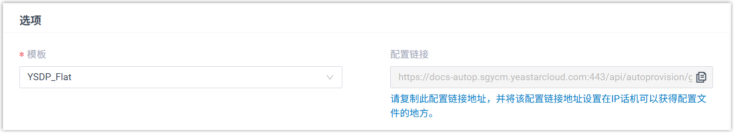- 配置链接:PBX 自动生成一个配置链接,此链接提供了话机的配置文件所存储的位置。注: 记录下配置链接,后续在话机上配置时需要使用此链接。
