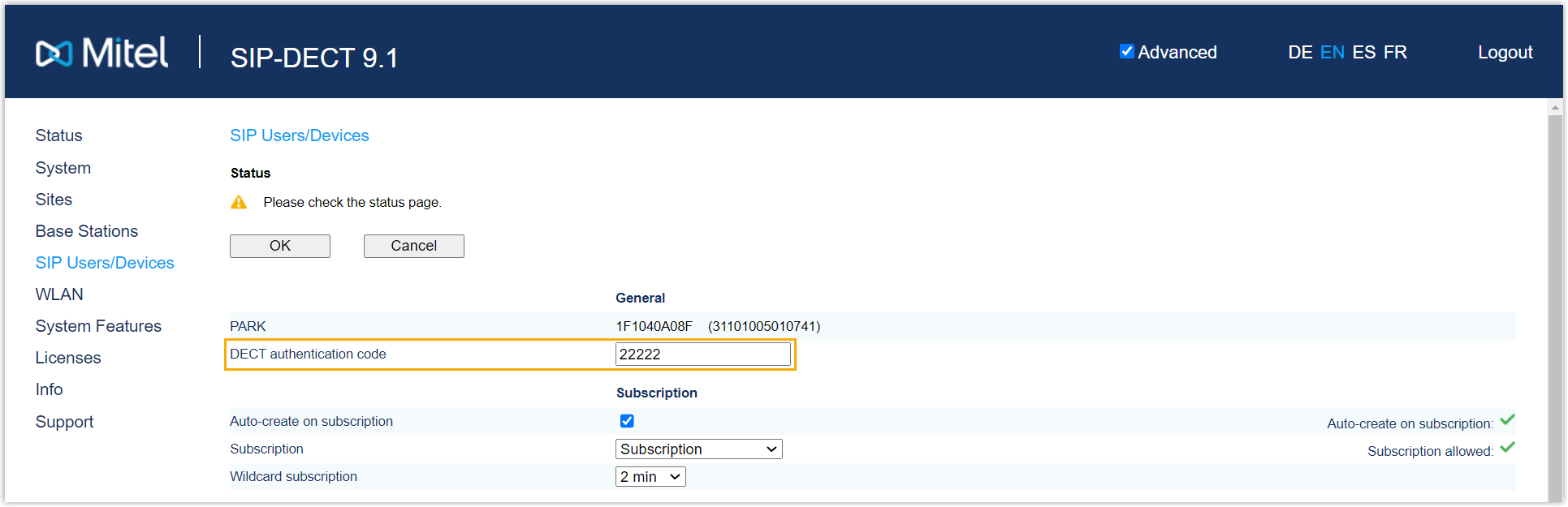 - 在 DECT 基站的网页中,可在 中查看 DECT 手柄的订阅状态。