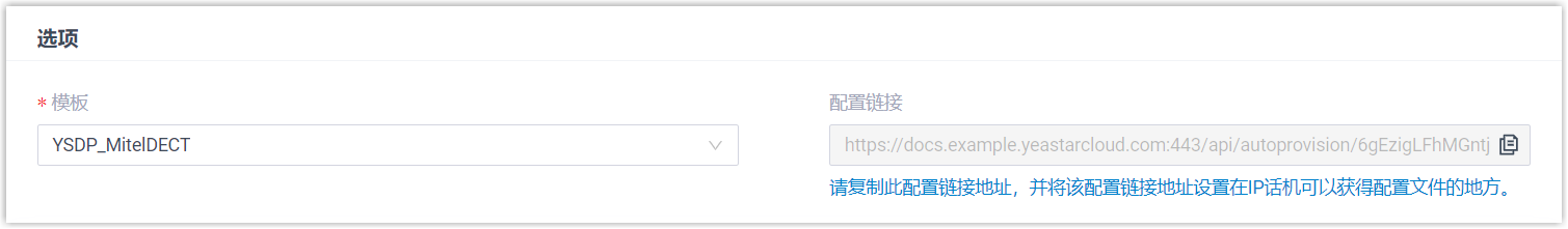- 配置链接:PBX 自动生成一个配置链接,此链接提供了话机的配置文件所存储的位置。注: 记录下配置链接,后续在话机上配置时需要使用此链接。
