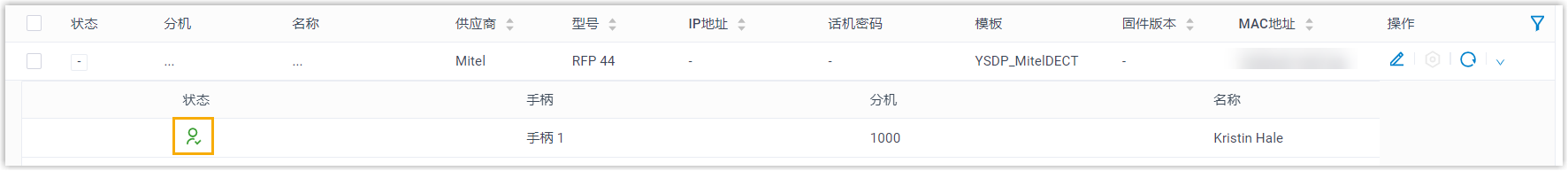 - 手柄成功注册到 DECT 基站,并通过基站与 PBX 分机绑定。