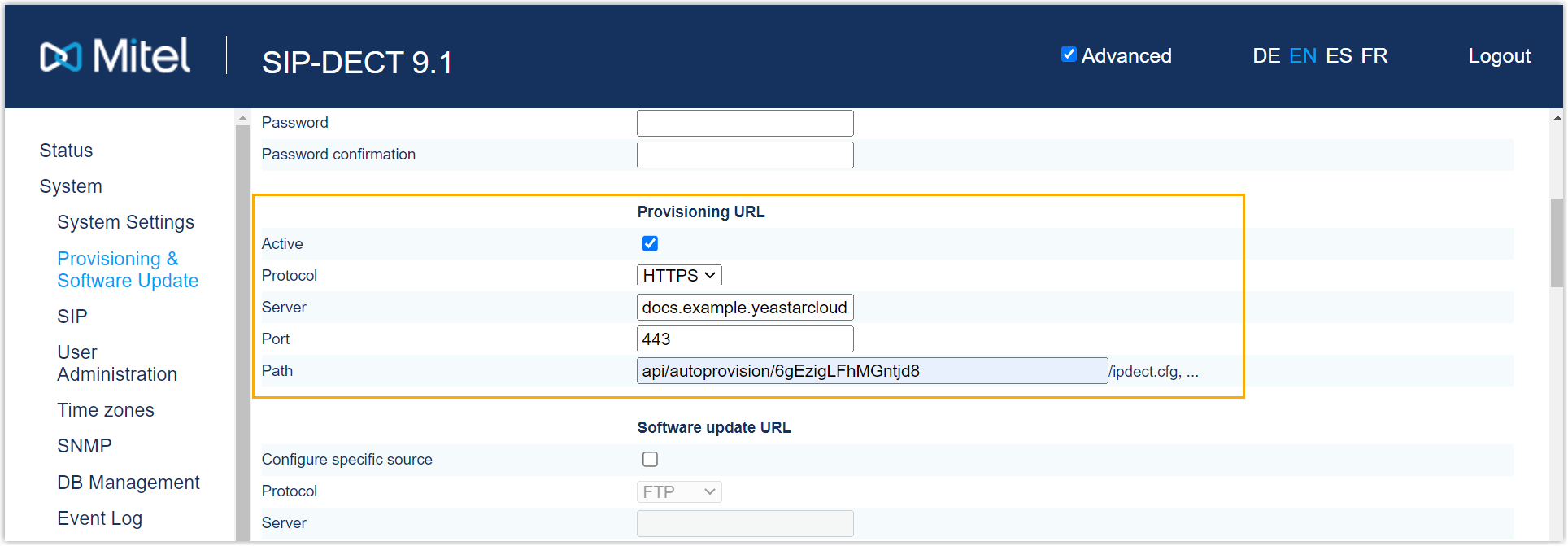 步骤二、在 Mitel DECT 基站上设置配置URL