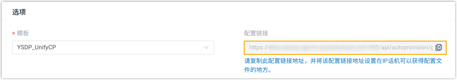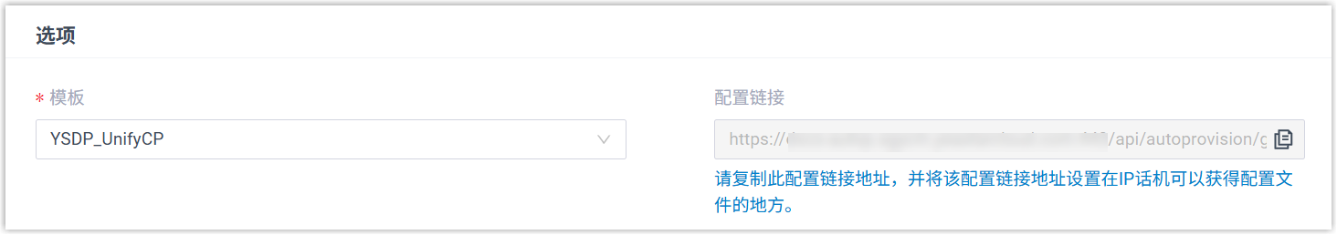 - 配置链接:PBX 自动生成一个配置链接,显示在此字段中。此链接指向话机配置文件所存储的位置。注: 记录下配置链接,后续在 DHCP 服务器上配置时需要使用此链接。
