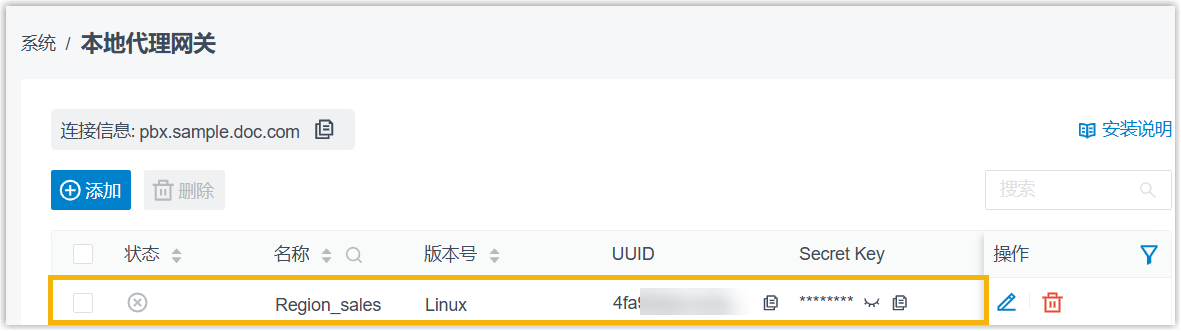 本地代理网关实例将显示在本地代理网关的列表中,并附带系统自动生成的连接信息 (连接地址、UUID 及密钥)。