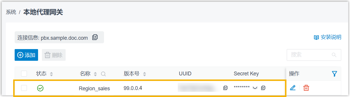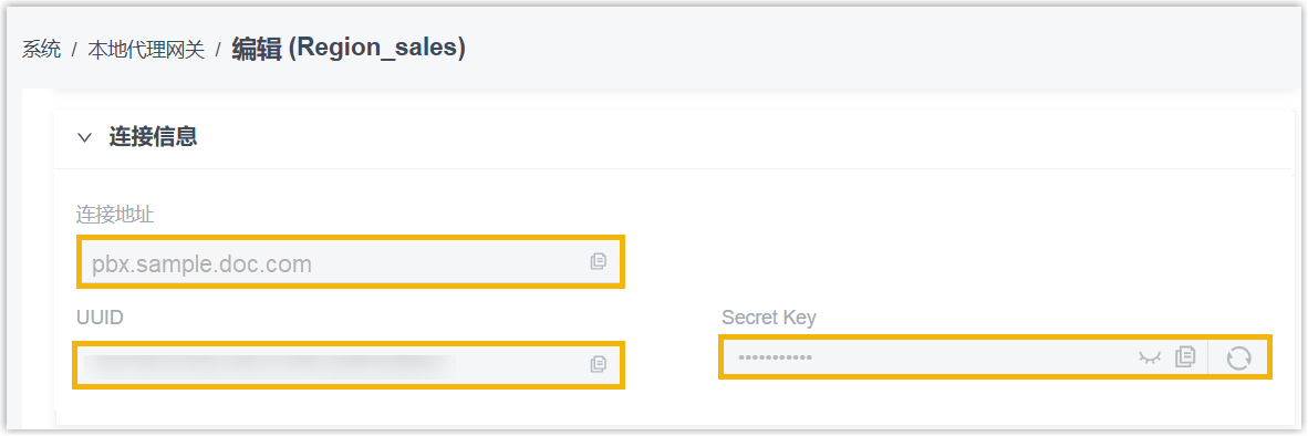 已在 Yeastar PBX 上添加本地代理网关实例 并获取连接凭证 (连接地址、UUID 及密钥) (路径:)。注: 为防止 Secret Key 已被使用,建议刷新并复制新生成的密钥。