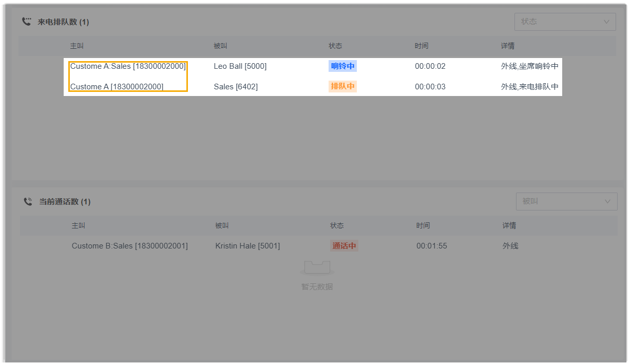 若启用,队列面板的 来电排队数 和 当前通话数 面板中将展示根据号码匹配到的企业联系人信息。即使用户没有查看企业联系人的权限,也能看到相应的信息。