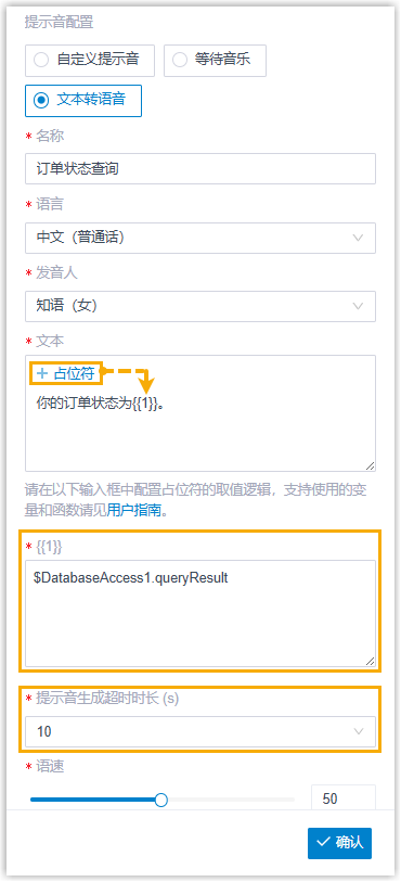 - 支持在文本栏中添加多达 10 个变量占位符,系统可根据变量值动态生成文本并播放语音提示。