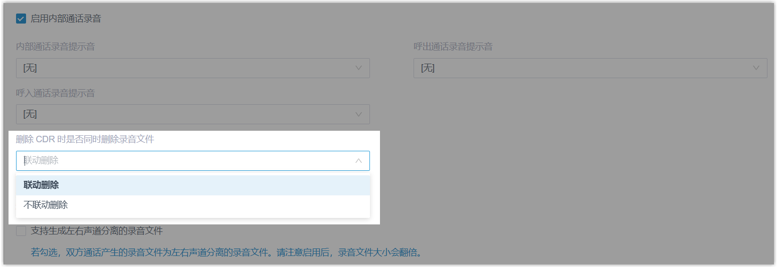 - 优化录音功能设置:新增配置项 删除 CDR 时是否同时删除录音文件 (路径:),用于控制在手动删除 CDR 时是否同步删除对应的录音文件。