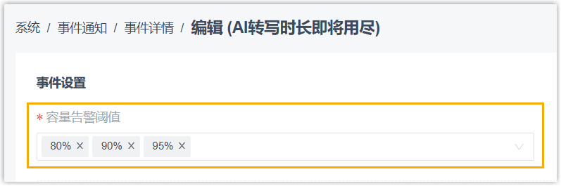 配置项 (路径:),允许你自定义容量阈值,以便系统在 AI 转写使用容量达到指定阈值时发送事件通知。