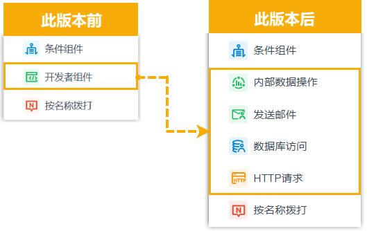开发者组件 / 左侧工具栏中的原 开发者组件 拆分为四个独立组件,包括 内部数据操作、发送邮件、数据库访问 和 HTTP请求。