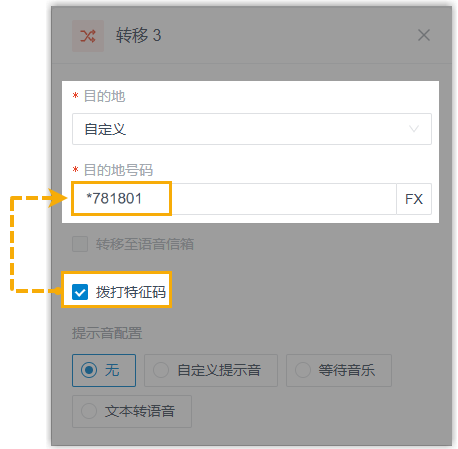 栏中设置需要自动拨出的特征码。注: 不支持通话中操作类的特征码,如录音 (