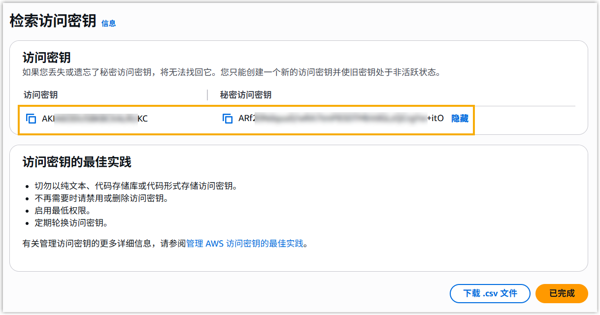 - 在 检索访问密钥 页面,点击 下载 .csv