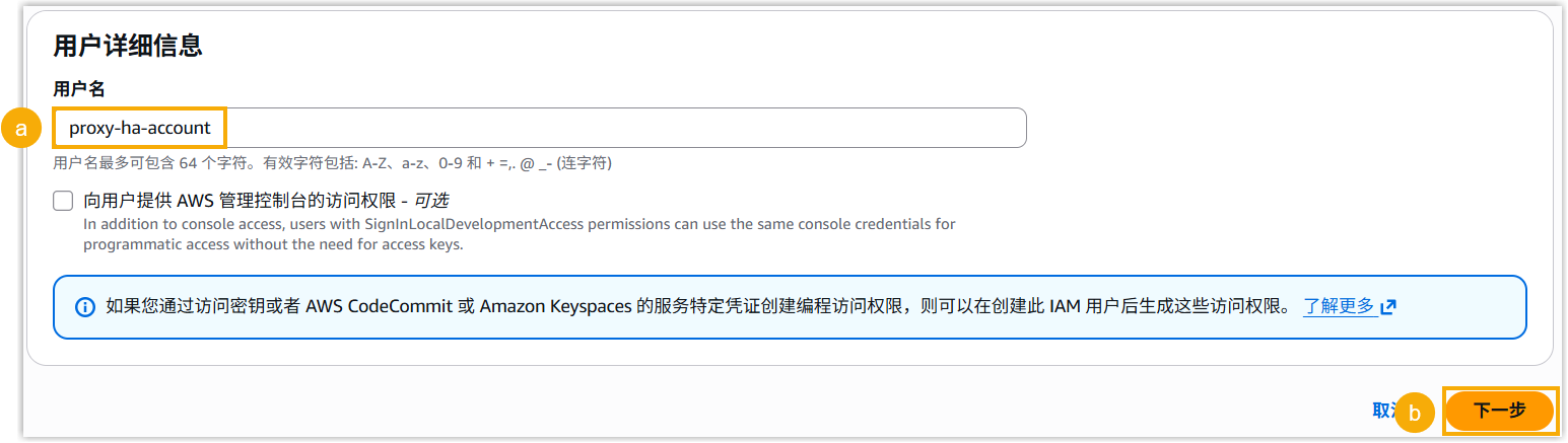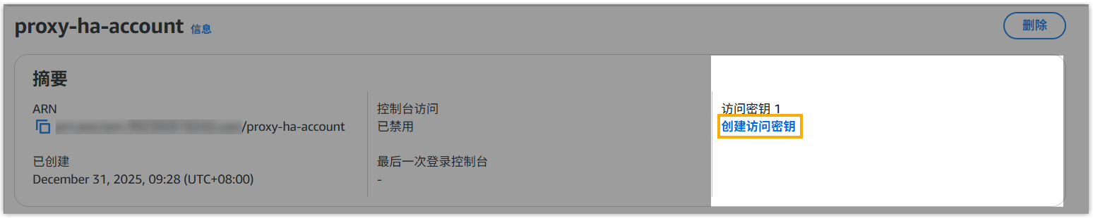 生成服务账户的访问密钥对。此密钥对将在 SBC Proxy 高可用切换期间,用于对你的指定 AWS 资源进行安全、自动化的访问。