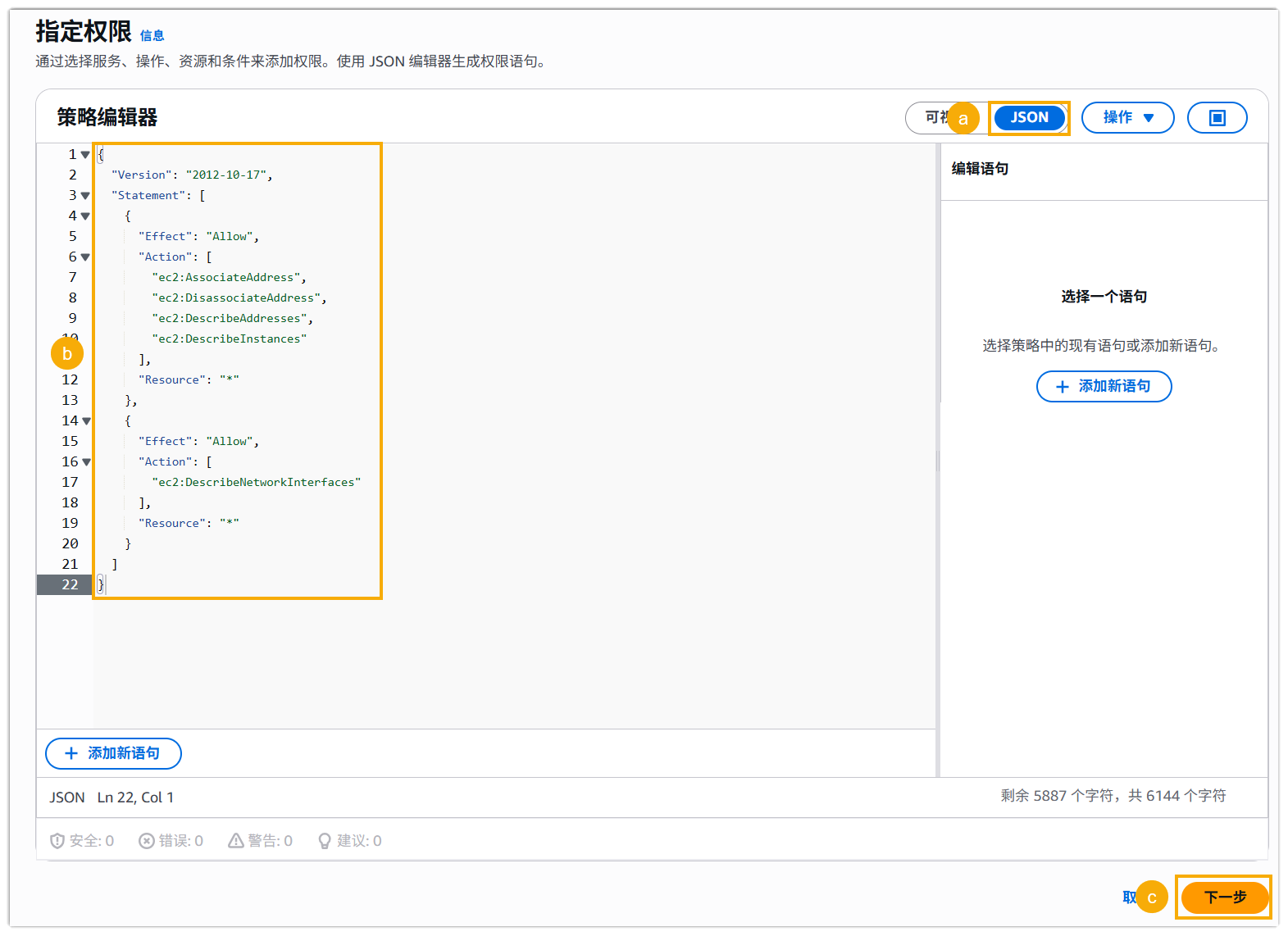 { "Version": "2012-10-17", "Statement": [ { "Effect": "Allow", "Action": [ "ec2:AssociateAddress", "ec2:DisassociateAddress", "ec2:DescribeAddresses", "ec2:DescribeInstances" ], "Resource": "*" }, { "Effect": "Allow", "Action": [ "ec2:DescribeNetworkInterfaces" ], "Resource": "*" } ] } - 点击 下一步。