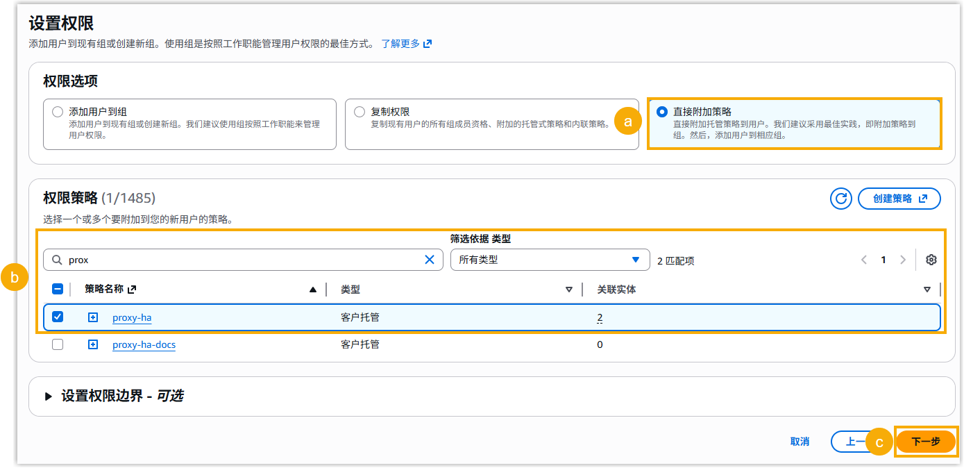 - 在 权限策略 栏,搜索并选择 你创建的策略。