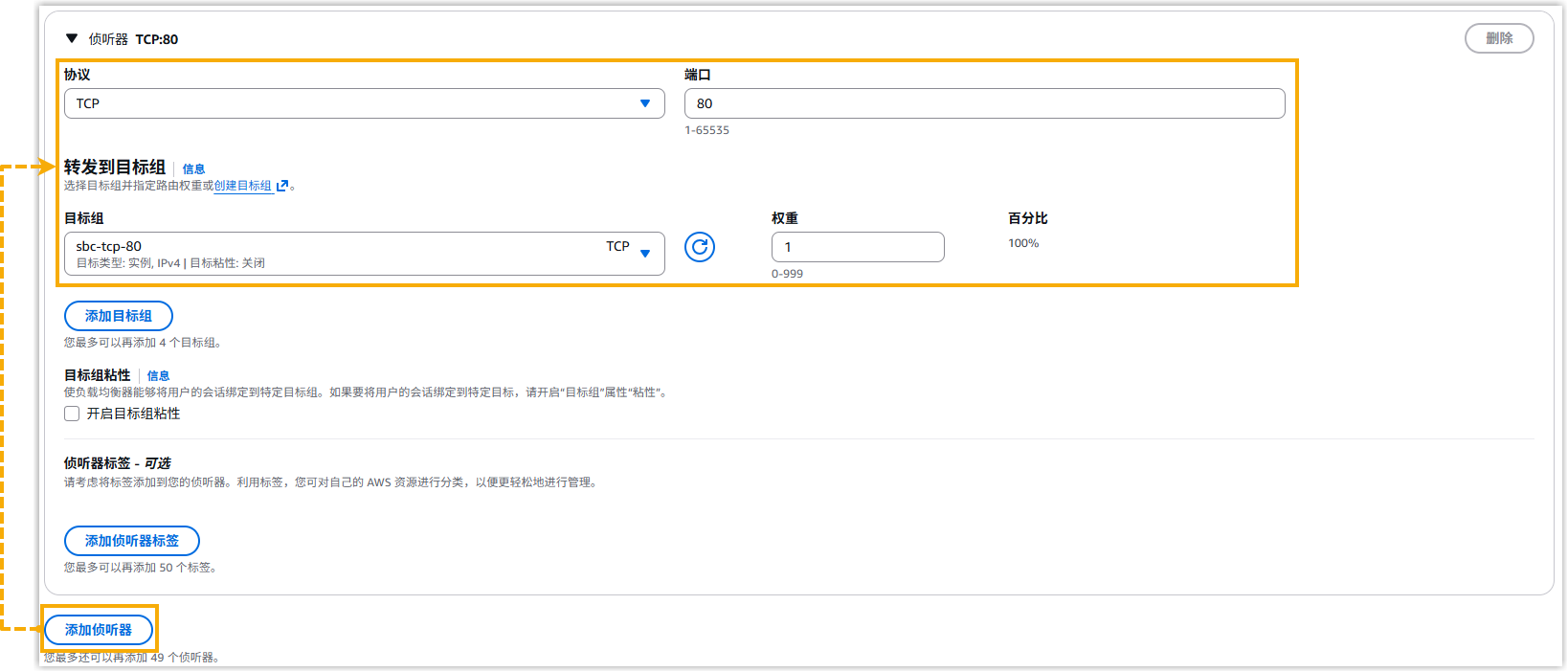 - 在 侦听器和路由 栏,为你创建的每个目标组各自添加一个侦听器。