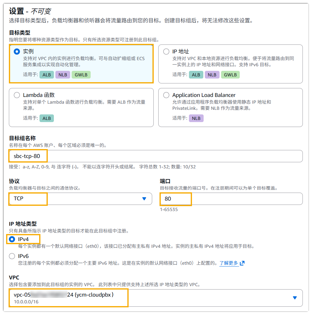 - 目标组名称:输入一个名称,帮助你识别此目标组,如 sbc-tcp-80。