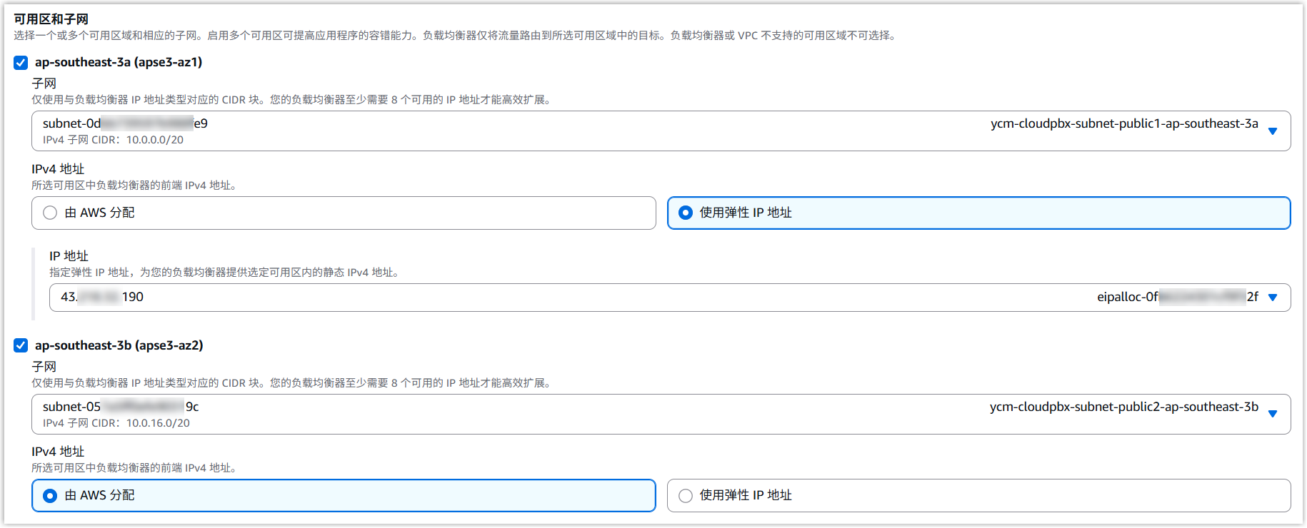- IPv4 设置:在每个可用区中分配一个弹性 IP 地址。注: 为确保公有 IP 地址固定,请勿在两个可用区中都使用由 AWS 自动分配的 IP。你必须在至少一个可用区中,使用 使用弹性 IP 地址 选项,手动分配一个弹性 IP。