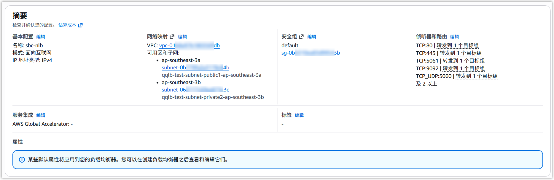 - 负载均衡器名称:输入一个名称,帮助你识别此负载均衡器。在本例中,输入 sbc-nlb。