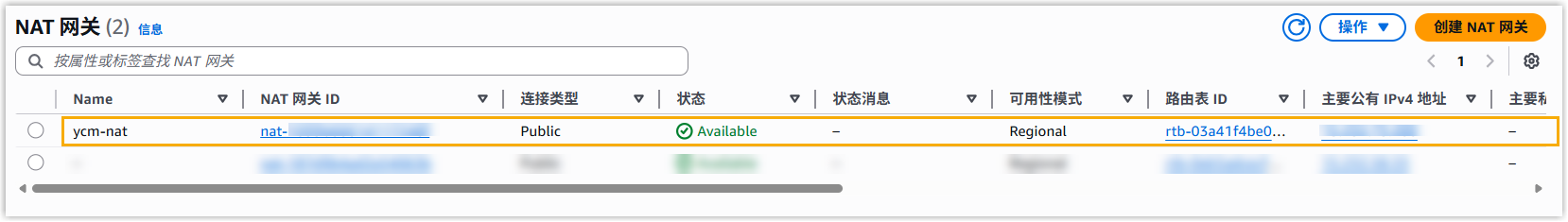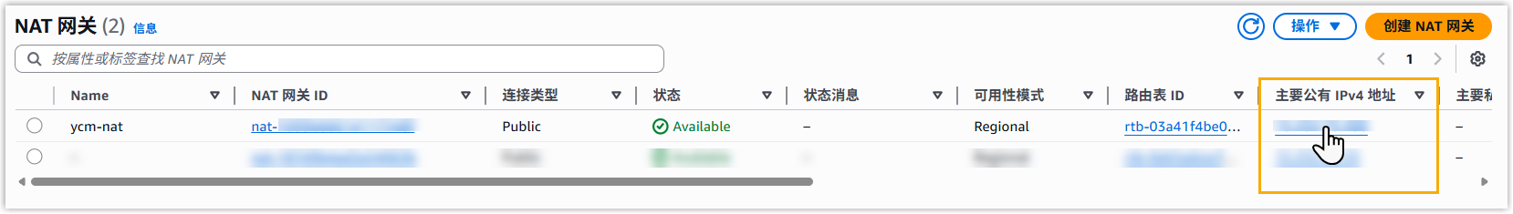 - 在 NAT 网关 列表中,点击新创建的 NAT 网关的 主要共有 IPv4
