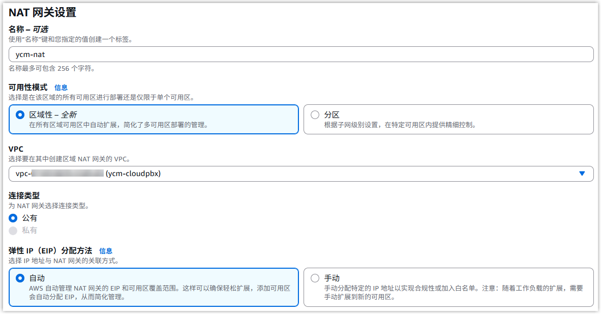 - 名称:可选。输入一个名称,帮助你识别此 NAT 网关。在本例中,输入 ycm-nat。