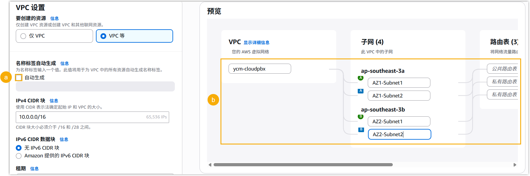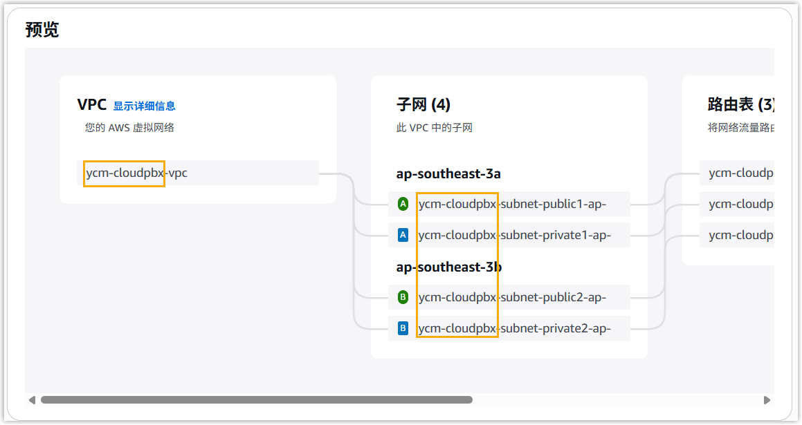 AWS 将基于此 VPC 名称自动为其他资源生成名称标签,可在右侧 预览 栏中查看。