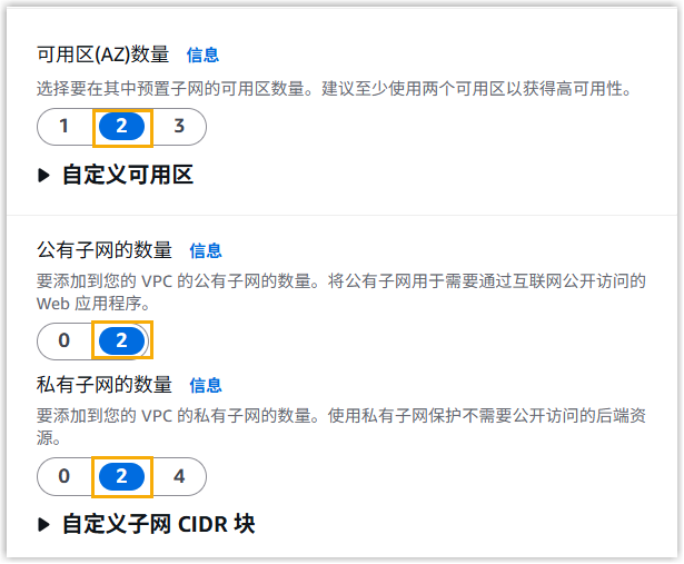 - 可用区(AZ)数量:选择要跨多少个可用区部署资源。在本例中,选择 2。