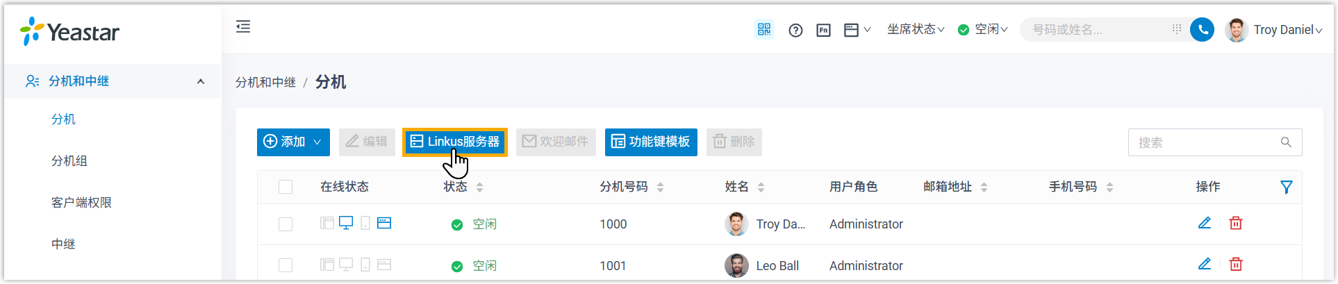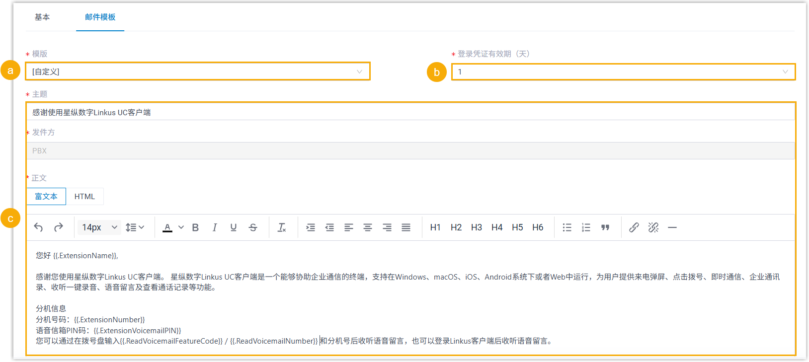 注: 默认情况下,PBX 使用预设的邮件通知语言发送 Linkus 欢迎邮件。如有需要,可进入 进行修改。