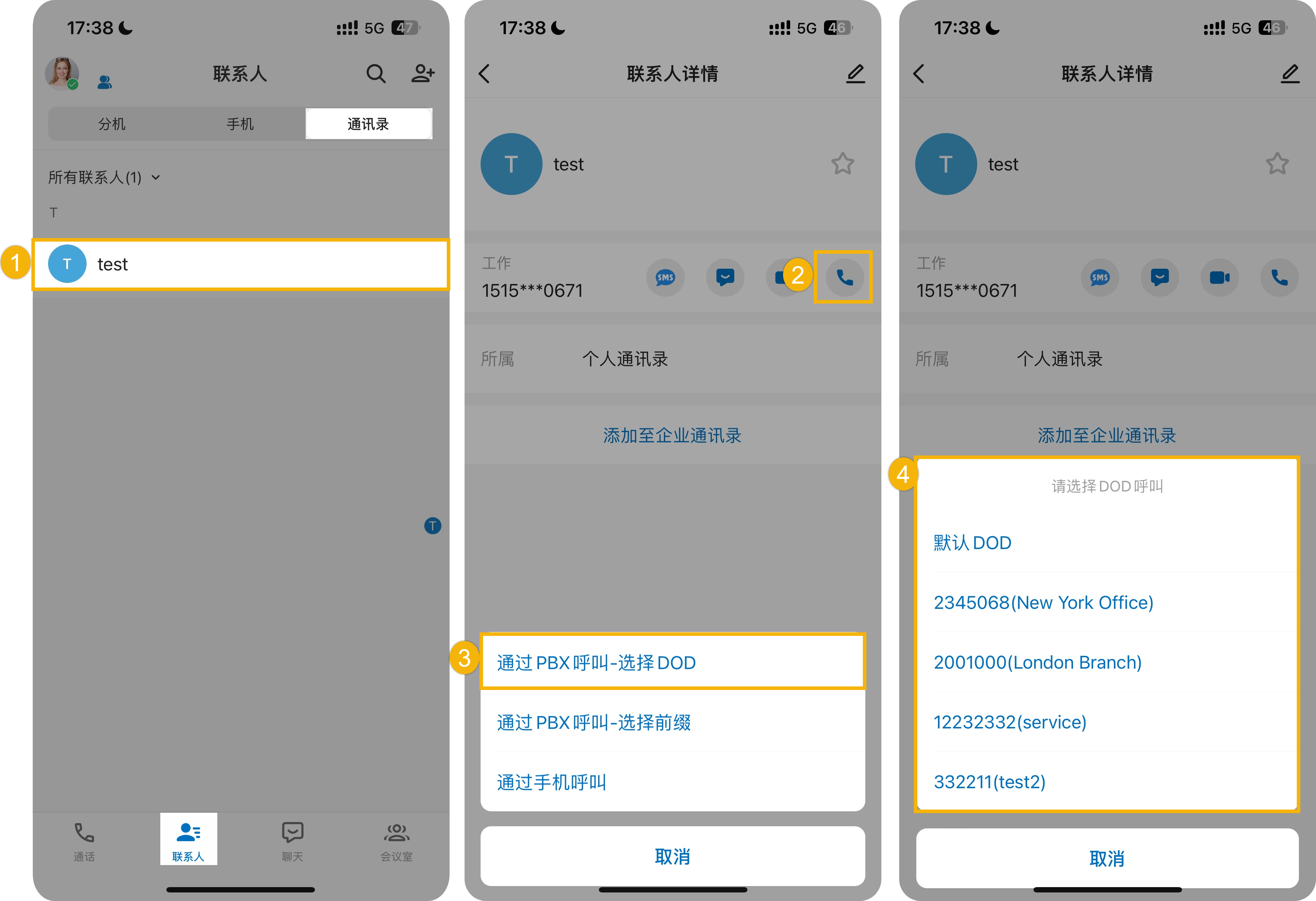 。 - 点击 通过 PBX 呼叫-选择 DOD。