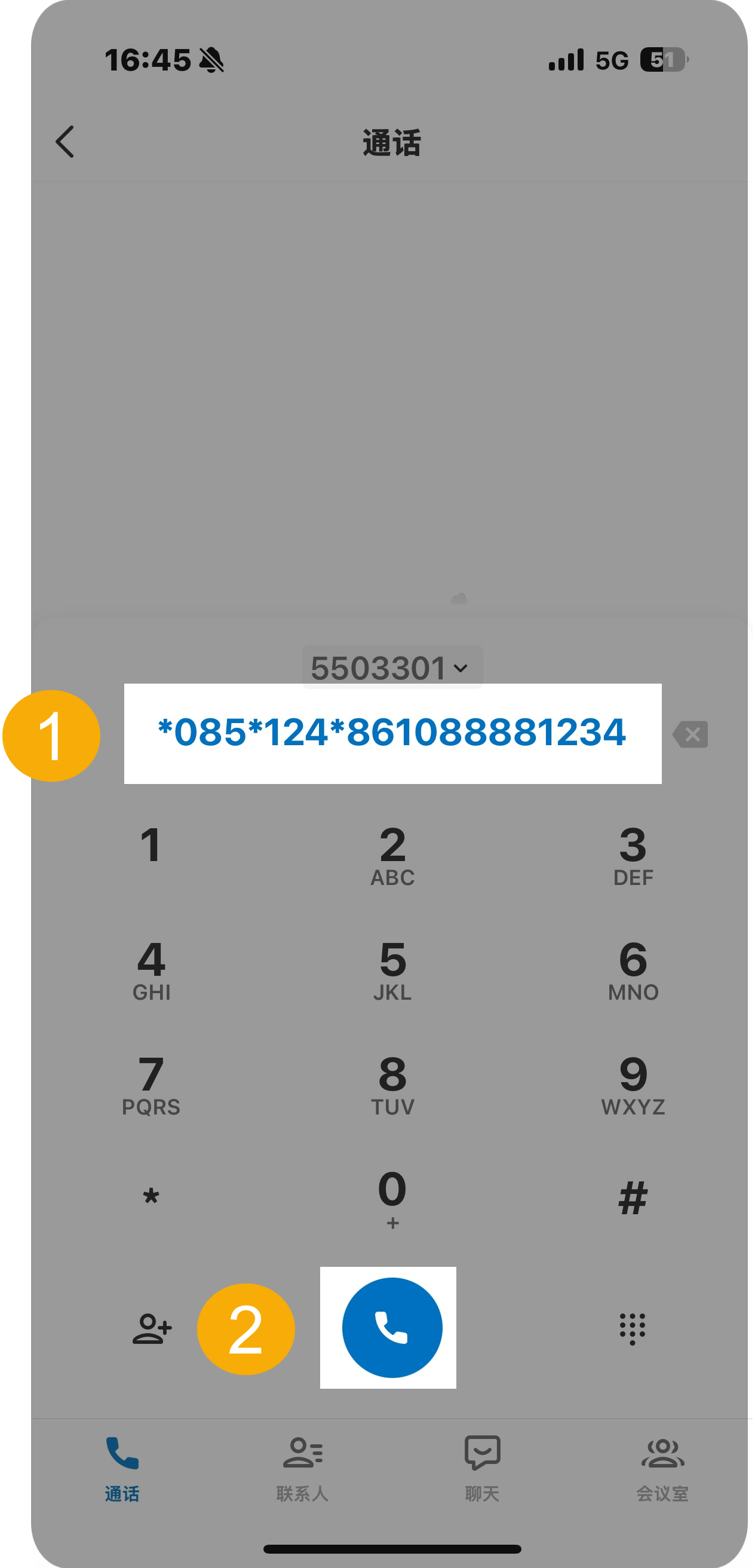 注: 要使用此方式,需先向系统管理员获取去电显示号码前缀特征码和具体 DOD 号码对应的短号。- 在拨号盘中,输入特征码与短号/具体 DOD 号码。