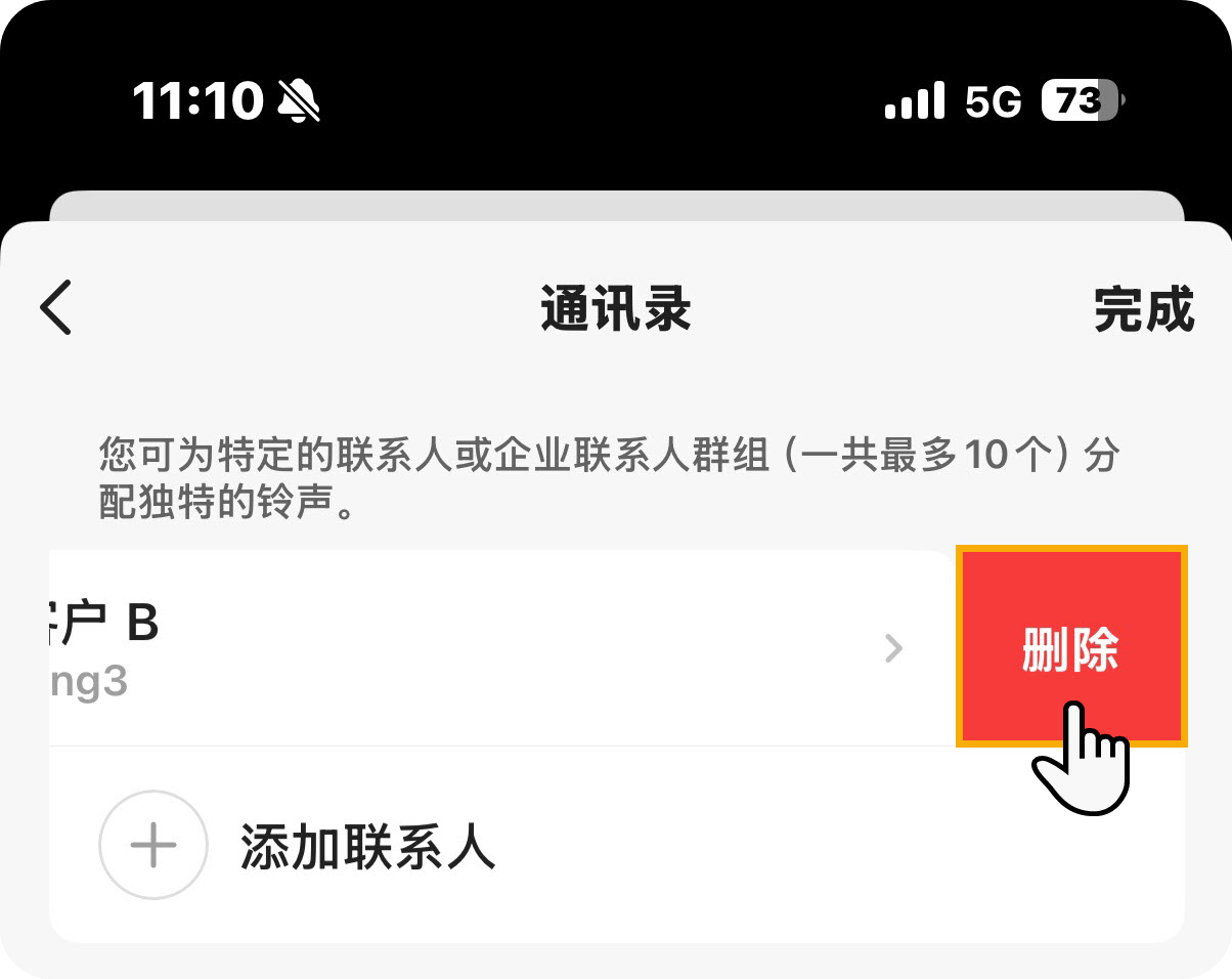 - 在 通讯录 页面,点击 添加联系人,添加一条铃声规则。