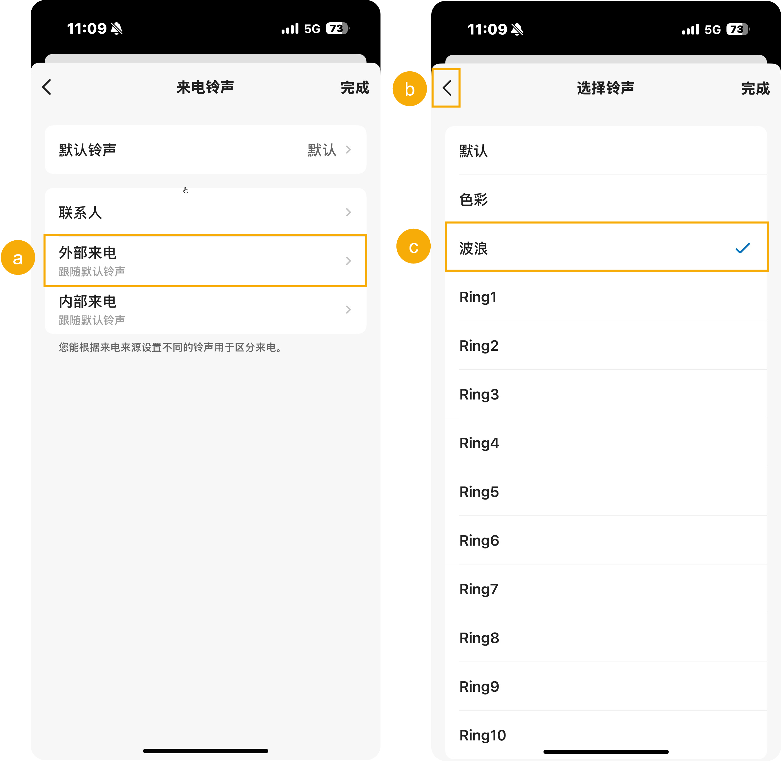 - 若使用 Linkus 安卓端,你可以点击 自定义 选择手机本地的铃声。